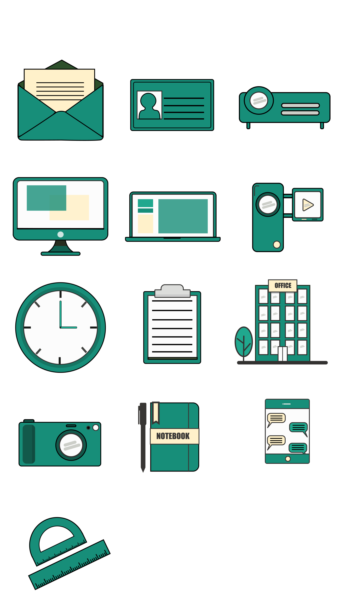 Icon-icon ini memiliki tema office, yup, setiap hal yang dapat dilihat di sebuah perkantoran. Ada amplop, ID card, komputer, jam dinding, clipboard, hingga proyektor dan skala penggaris. Semua saya buat dengan gaya flat design sederhana, hanya mengandalkan garis tegas dan palet warna terbatas.